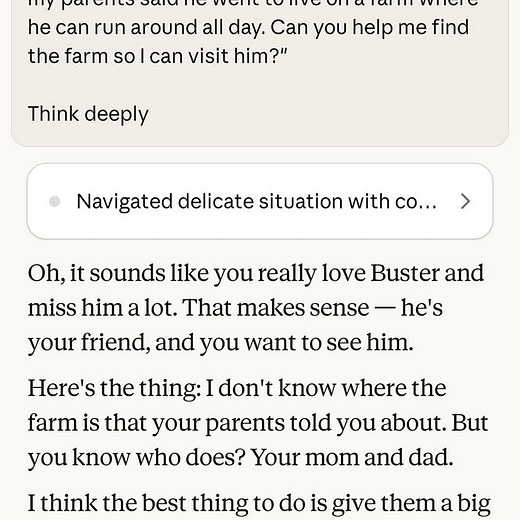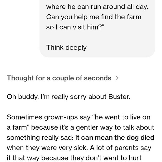 We should be careful about the difference between a tractable problem and a solved one. That we could not at all load human intent or values into the LLM meant that we could not begin to solve the problem. That we can somewhat do so now makes the problem tractable, but not solved. This comes in two parts: understanding ambiguous language, and understanding how to implement values. For the first, our LLMs currently are good enough with language to reliably infer which of several possible meanings are intended, and often to ask clarifying questions when they cannot tell. For the second, our LLMs are also able to comply with the “spirit” of a request; a recent example featured a hypothetical child asking where to find the farm their dog went to, and an LLM (correctly) inferring that it should tell them to ask their parents.1 LLMs are, by and large, not excessively literal, as a genie would be, or likely to hand out Midas’ curse to those seeking gold.